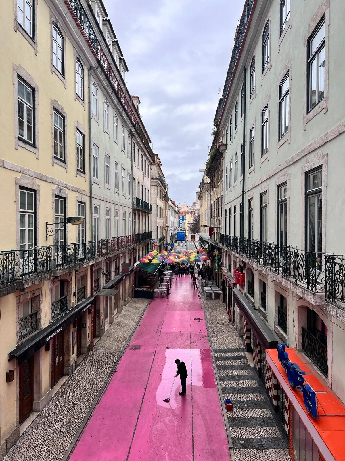 The next day, despite the forecast predicting rain all day, we quickly learned how unpredictable Lisbon’s weather can be—it only rained for about an hour! We set off to explore walking down the street, and got to see Pink Street from above, which was NOT what I was expecting. It was quite early, so they were cleaning the street from the night before. Pink street was kinda looking like gray street from all that partying I guess. No cute pictures there for me!