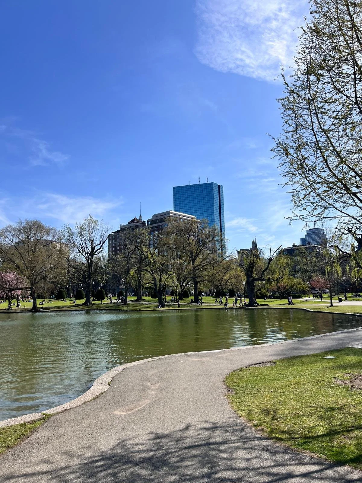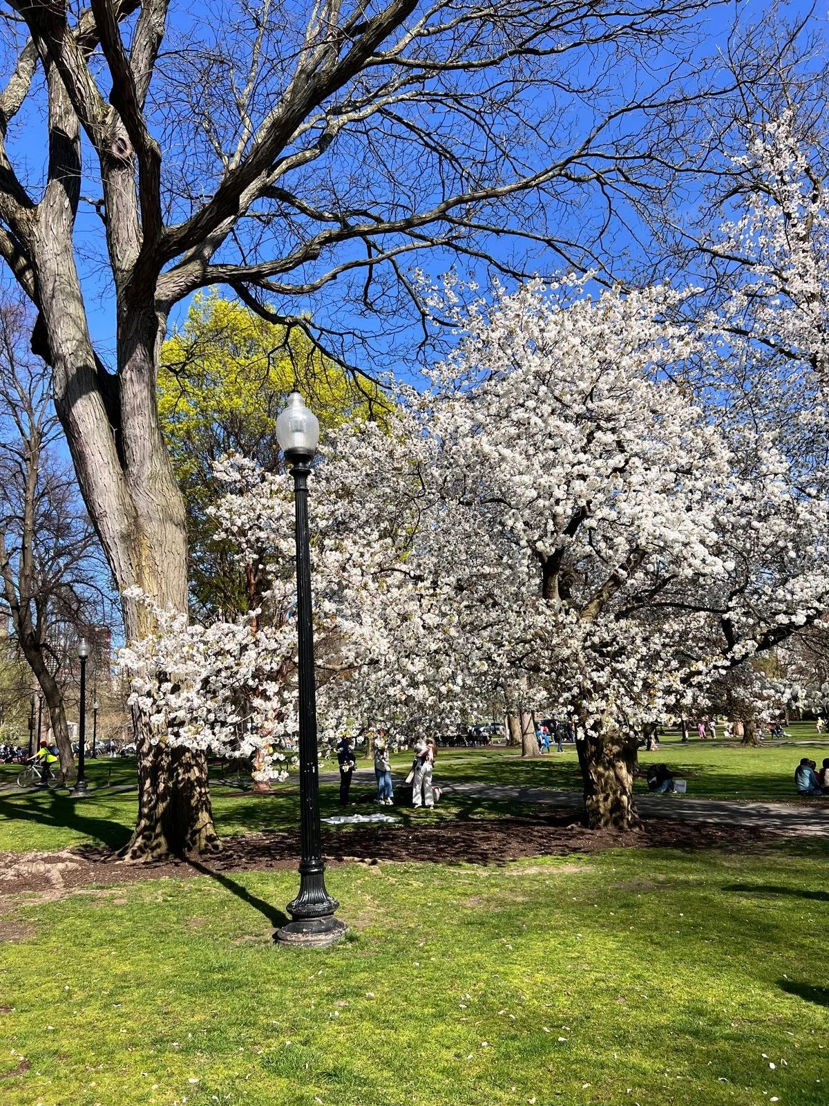 We flew into Boston around 2pm and spent the rest of the day exploring the city. Our first stop was the Boston Public Garden. We could not have come at a better time—the cherry blossoms and magnolias were in full bloom, and they were absolutely stunning. I’m talking pink petals everywhere, lining the streets, scattered across the park, and adding a magical feel to the whole city. The trees were mostly magnolias, and the way they framed the skyline was unreal. It honestly felt like walking through a floral fairytale.