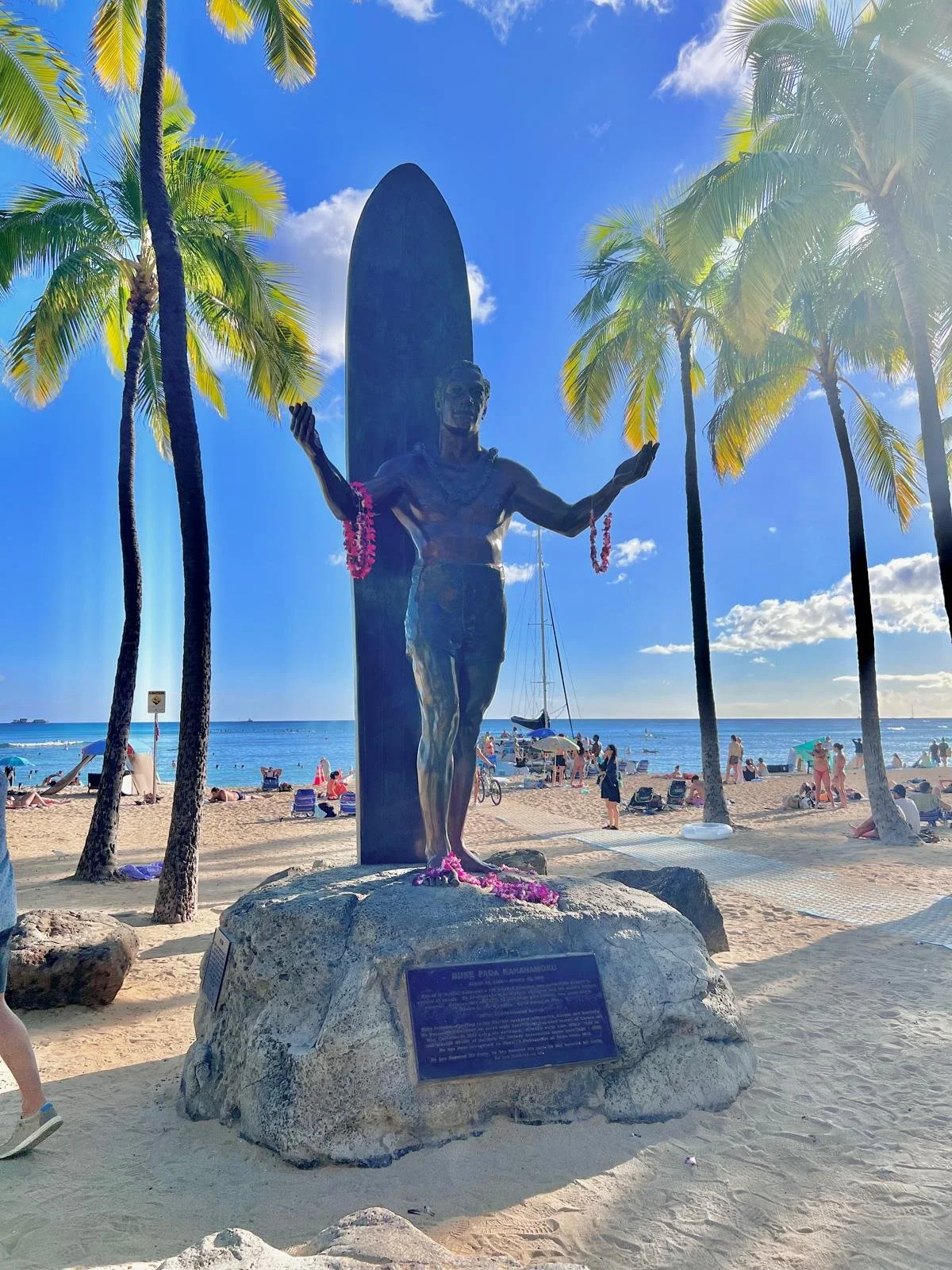 As we walked off our snacks, we wandered through the International Marketplace—an open-air shopping center that’s great for everything from picking up souvenirs to grabbing a bite. It’s a fun place to stroll around and looks pretty cool. We also made sure to walk along the beach, take pictures with the famous banyan tree, and of course, visit the statue of Duke Kahanamoku. Duke is known as the father of surfing and was a Hawaiian Olympic swimmer. His statue is an iconic Waikiki landmark, and youll usually catch him wearing flower leis as a sign of respect.