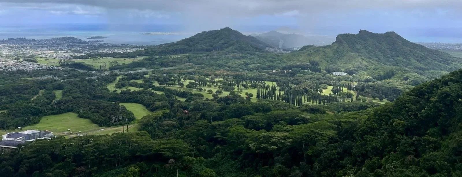 Next, we made our way to the Nuʻuanu Pali Lookout, which gives a completely different perspective. Strong winds whip through the valley here, and you’ll feel the power of nature all around. The view stretches across the windward coast, framed by sheer cliffs and rolling greenery—it’s dramatic and cinematic.